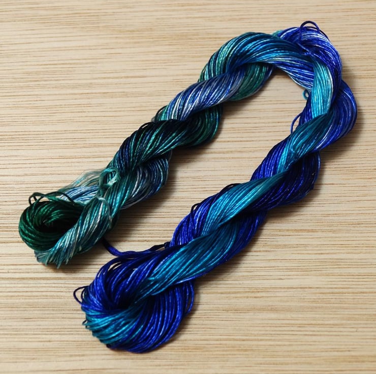 This embroidery thread is made from of 100% Silk and has been handdyed to create a variegated thread with lots of shades of turquoise and blue. It is perfect for any form of embroidery including cross-stitch, blackwork and free-hand embroidery. It will be sent already wound onto a bobbin.