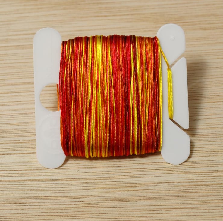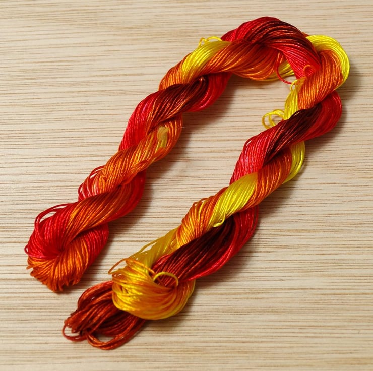 This embroidery thread is made from of 100% Silk and has been handdyed to create a bright, self-striping thread in shades of red, orange and yellow. It is perfect for any form of embroidery including cross-stitch, blackwork and free-hand embroidery. It will be sent already wound onto a bobbin.