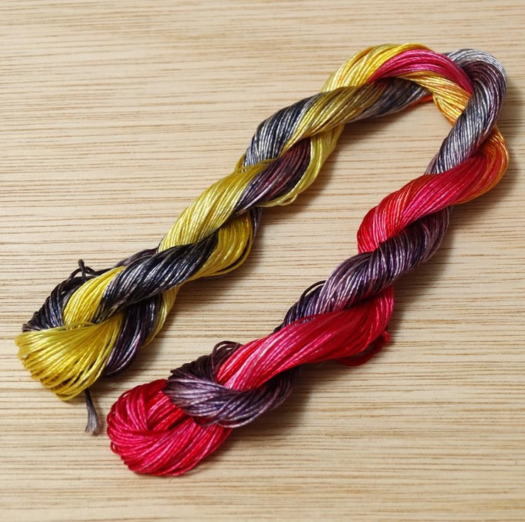 This embroidery thread is made from of 100% Silk and has been handdyed to create a variegated thread. It is perfect for any form of embroidery including cross-stitch, blackwork and free-hand embroidery. It will be sent already wound onto a bobbin.