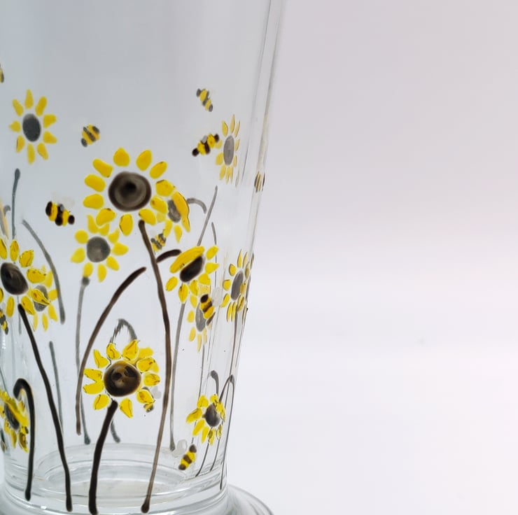 Hand painted latte glass with 'Sunflower & bee' design.