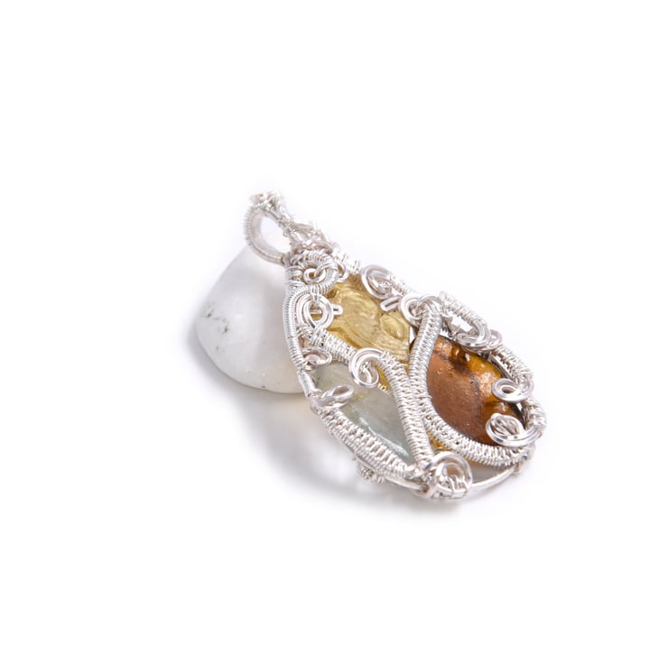 Discover the exquisite beauty of this delicate and elegant pendant crafted from three unique shards of sea glass intricately wrapped in silver-filled copper wire.