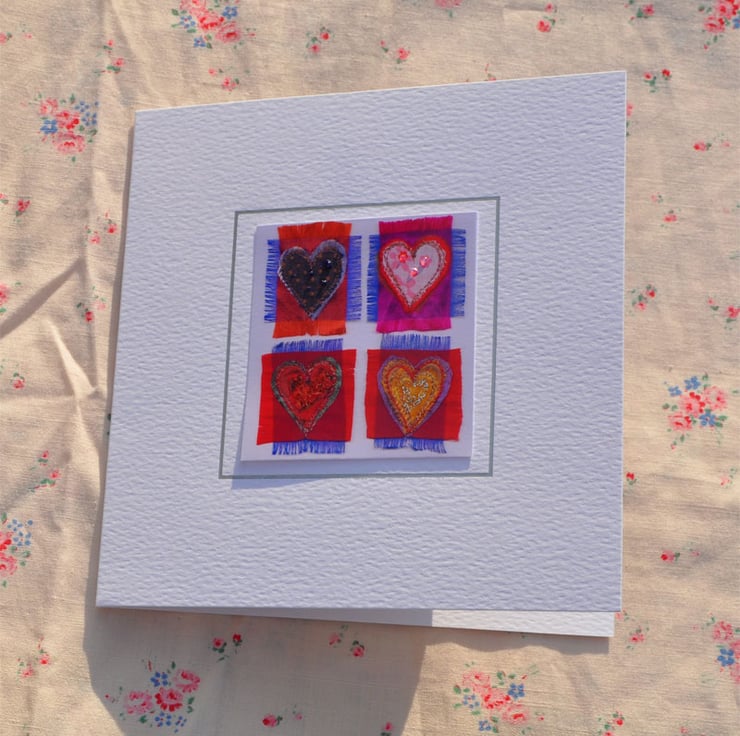 Vibrant four heart handmade card, perfect for a special someone. Designed and created by the artist Suzanne Hooson using free machine embroidery and beautiful layered fabrics, printed and hand finished with a sparkle of glitter.