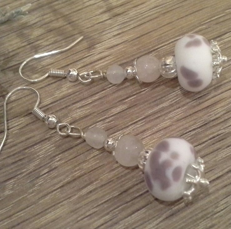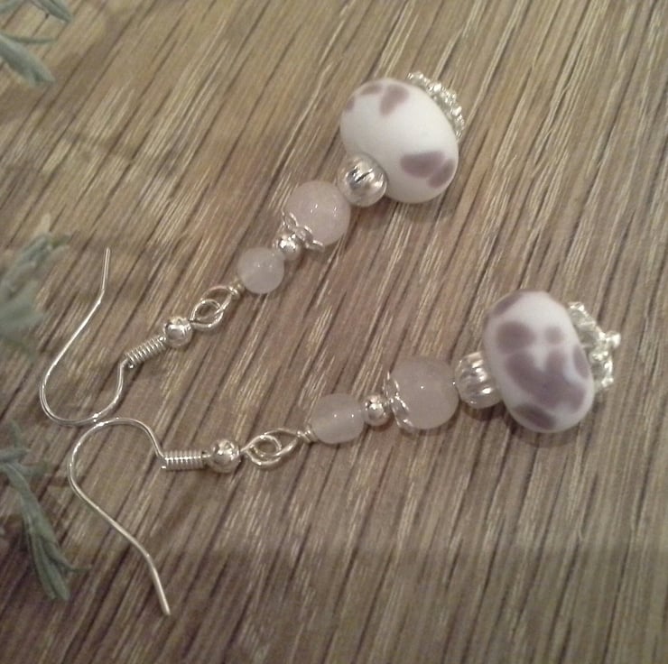 A beautiful pair of earrings designed and hand crafted in Cornwall using frit lampwork beads complimented with rose quartz gemstones. All other components are very high quality silver plated.