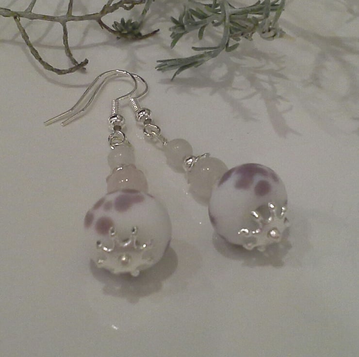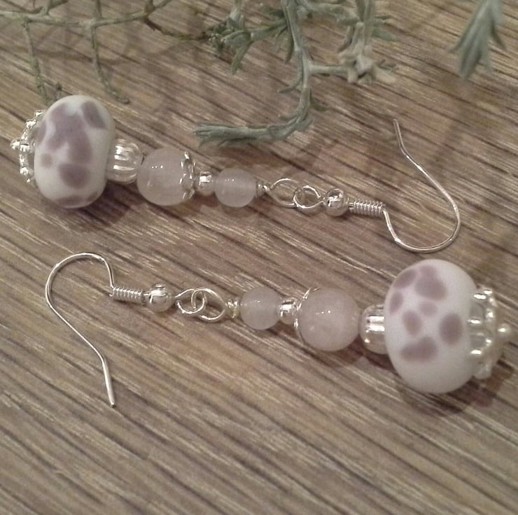 Hand Made Frit Lampwork Bead & Rose Quartz Earrings Silver Plate