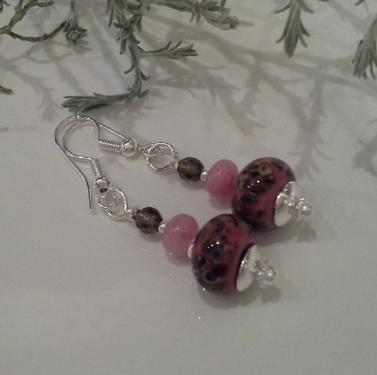 A beautiful pair of earrings designed and hand crafted in Cornwall using hand made frit lampwork beads complimented with pink quartzite and small faceted smokey quartz gemstones. All other components are very high quality silver plate.
