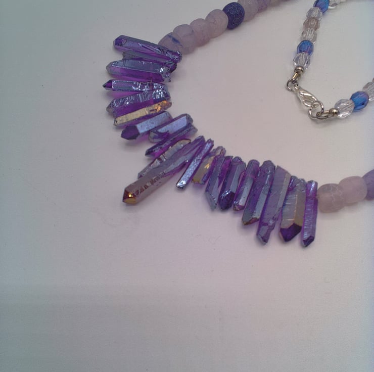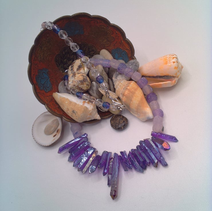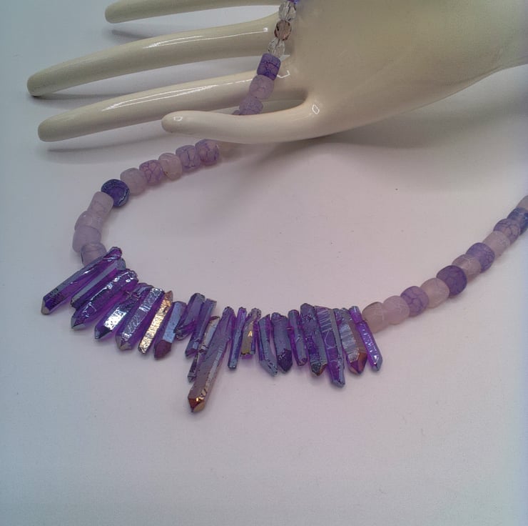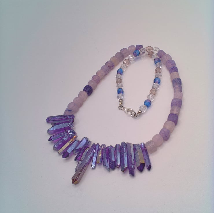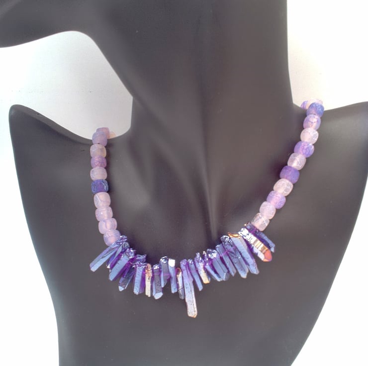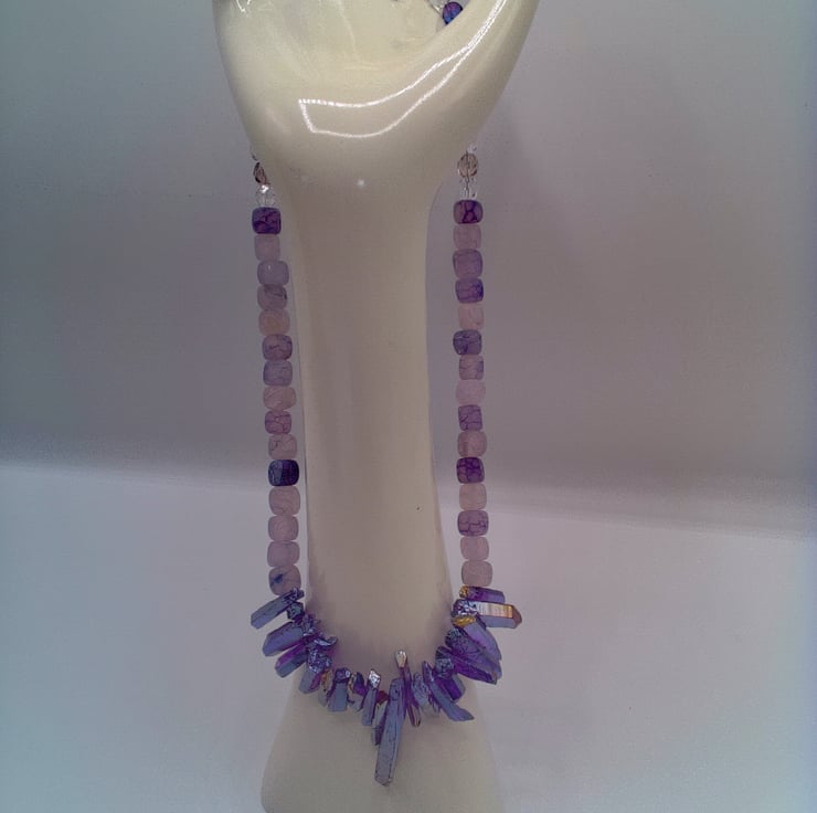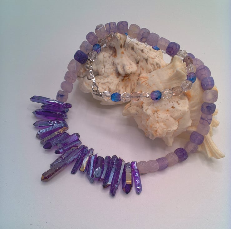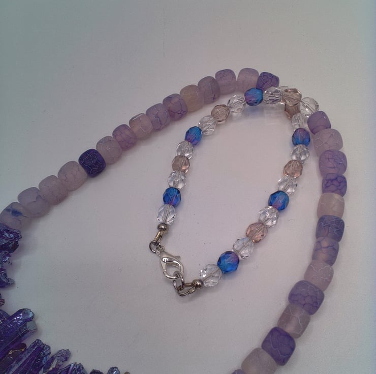 This stunning purple shard and lilac cracked agate necklace would look great with you outfit for a party or other special occasion. It would make a lovely gift for a friend or relative for a birthday or anniversary, or a gorgeous treat for yourself. The necklace is made using glass shards in varying sizes and shapes, shades of lilac 6 mm cracked agate cube beads and purple and clear glass 6 mm crystal beads. The necklace is approx. 18.5 inches (47 cm) in length. It is fastened with a silver plated lobster clasp. The necklace will be dispatched wrapped in tissue paper in an organza bag and delivered to you via Royal Mail first class post.