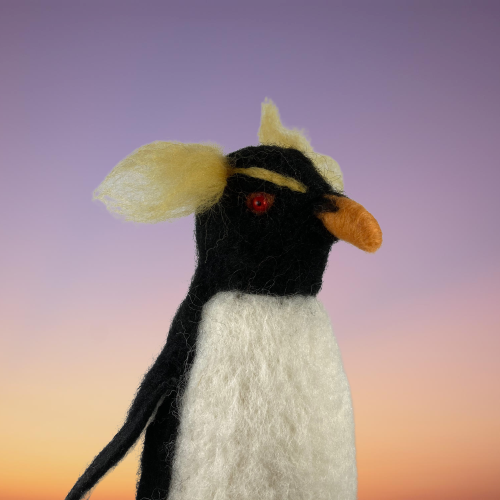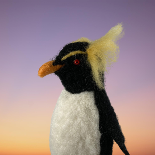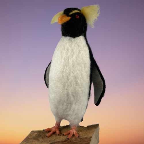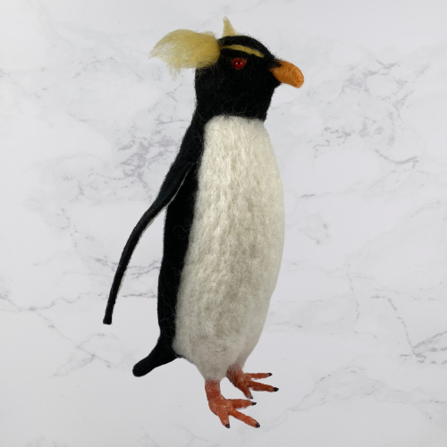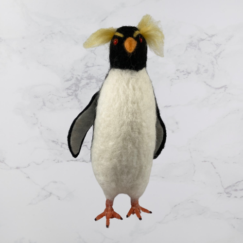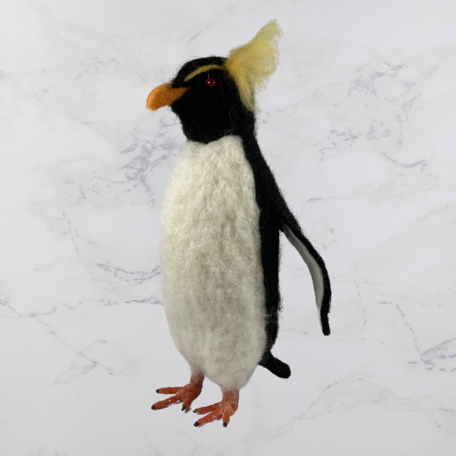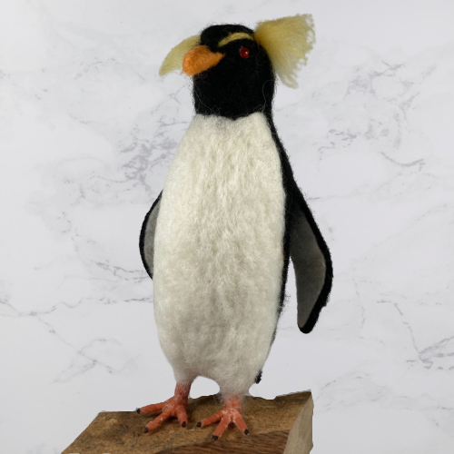 A rockhopper penguin needle felted from woollen fibres. A core of wool has been sculpted into shape using a barbed felting needle and then a top coat in the appropriate colours added. The feet are made using woollen fibres wrapped around a wire base and finished with a wax coating. The tail and wings are wired to enable them to be gently posed and coloured half pearl beads have been added for the eyes.