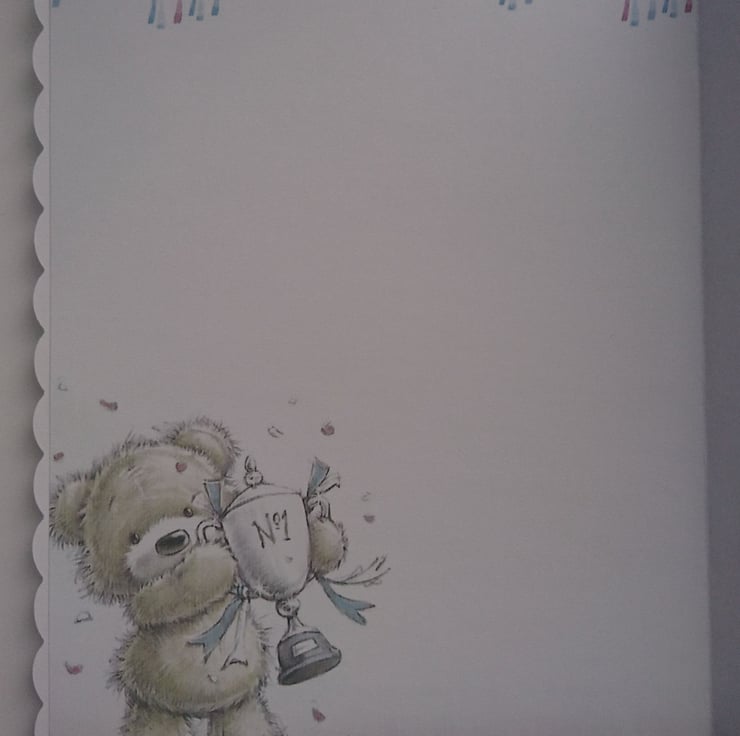 The design is a boy teddy bear holding a trophy cup adorned with ribbons. It's almost as big as he is - I hope he doesn't drop it!