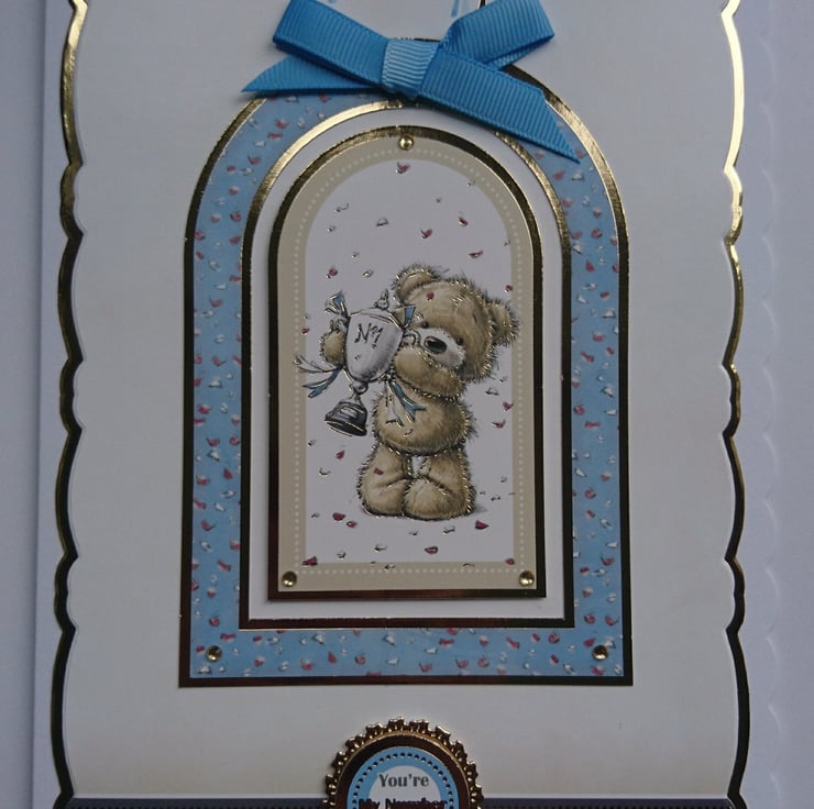 The 3D sentiment is gold foiled and says "You're My Number One!" and the card has been finished with gems and a matching ribbon bow. It's a very versatile card and can be given for any occasion including birthday, anniversary, Valentine's Day, Father's Day, thank you etc.