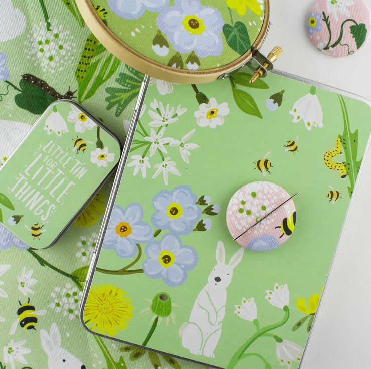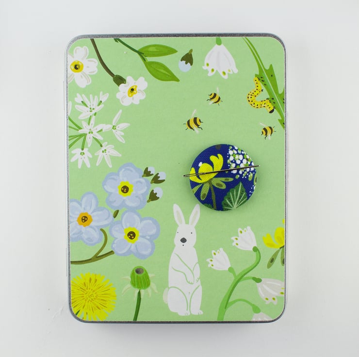 These craft tins are new for Spring. They are illustrated with my new fabric design "bunnies bears and bees". This tin comes with a magnetic needle minder made from our fabric. They hold everything from needles and pins to fabric scraps and thread/holders. They make beautiful keepsake gifts for friends, family and children. The illustrations are printed using high quality ink onto a textured quality stock and are bonded onto the tins. There is also an illustration of the wild flowers on the inside of the tin. The tins have a variety of other craft uses not just stitching, they can hold stationery, letters, jewellery, seeds, recipes etc.
