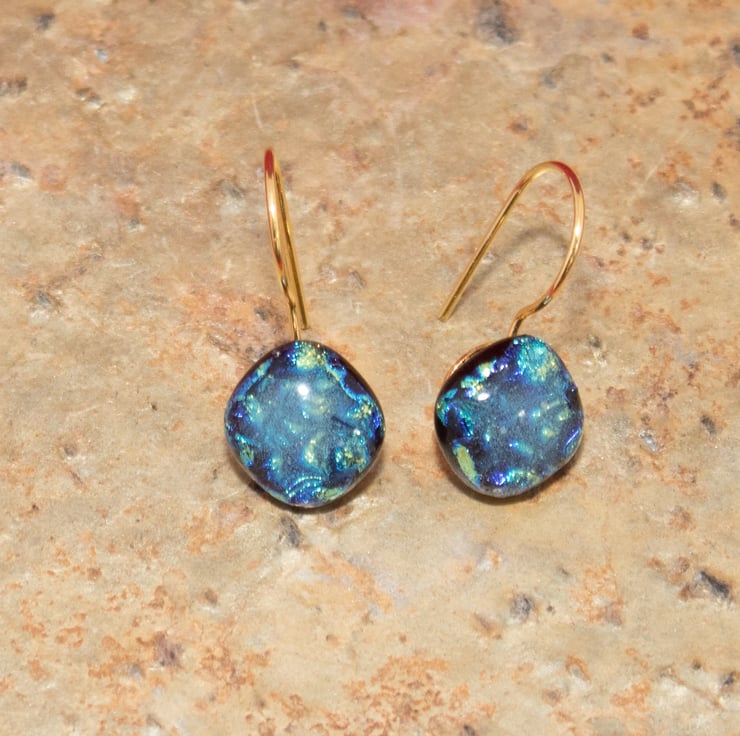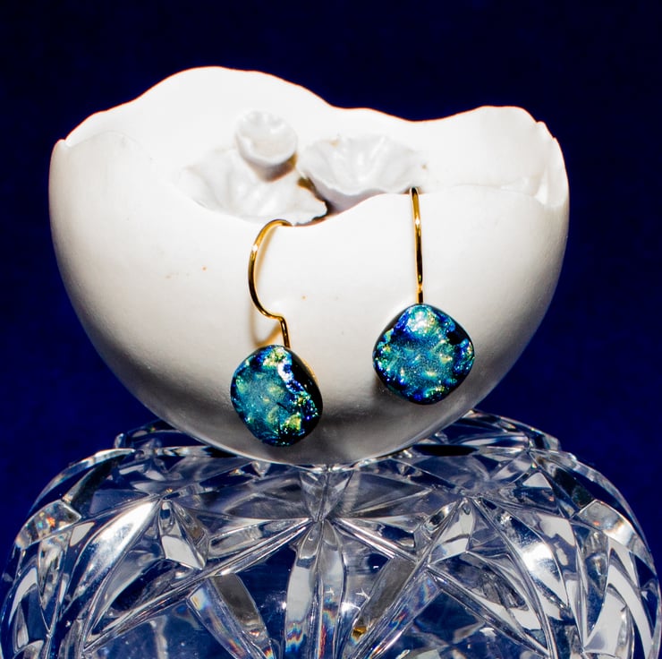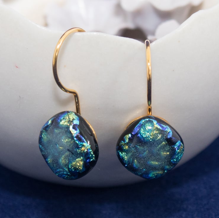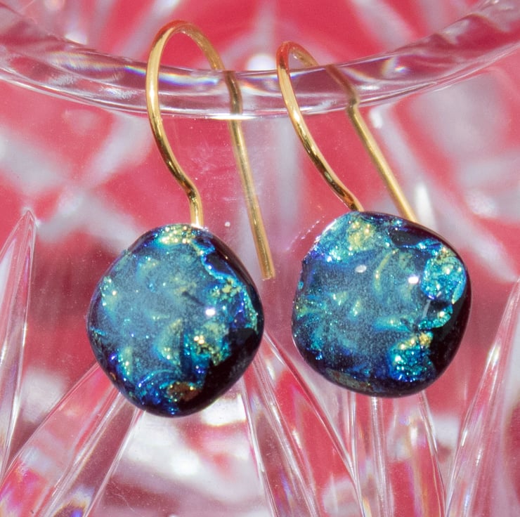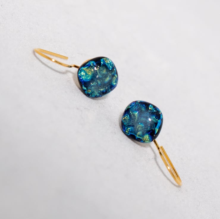 Each dot is made from a layer of textured silver glass that has been covered with a layer of blue powdered glass. A session in the kiln fuses everything together and rounds off the sharp edge. Once cooled we glue on the gold-plated wires.
