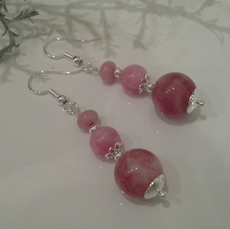 A beautiful pair of expensive looking earrings designed and hand crafted using genuine 12mm round cut pink quartzite with smaller graduating in size quartzite rounds. All other components are quality silver plated.