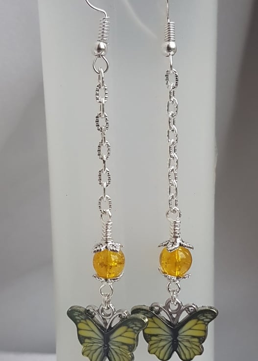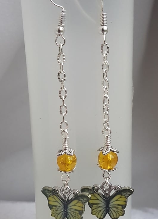 A fabulous dangly pair of earrings. Beautiful Yellow butterfly charms and Yellow crackle glass beads. Great as a gift.