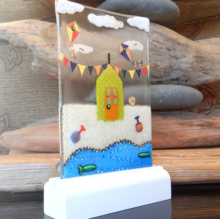 UNIQUE: Handmade Fused Glass 'BEACH HUT' Picture.