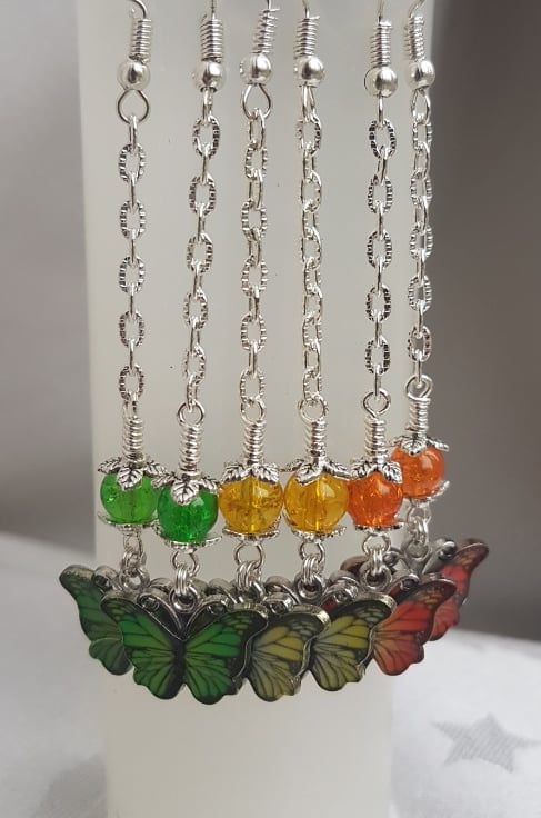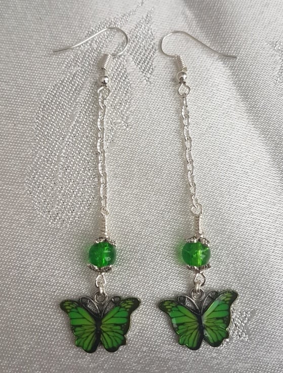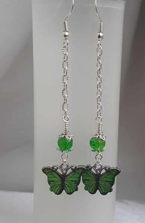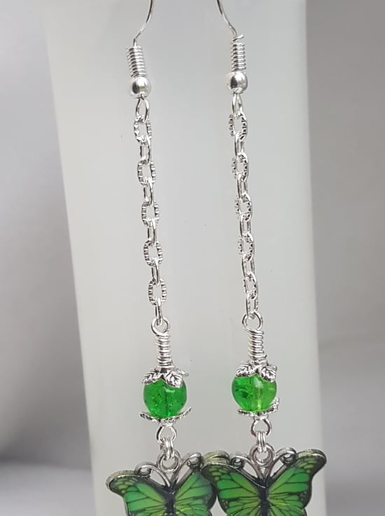 A fabulous dangly pair of earrings. Beautiful Green butterfly charms and Lime Green crackle glass beads. Great as a gift.
