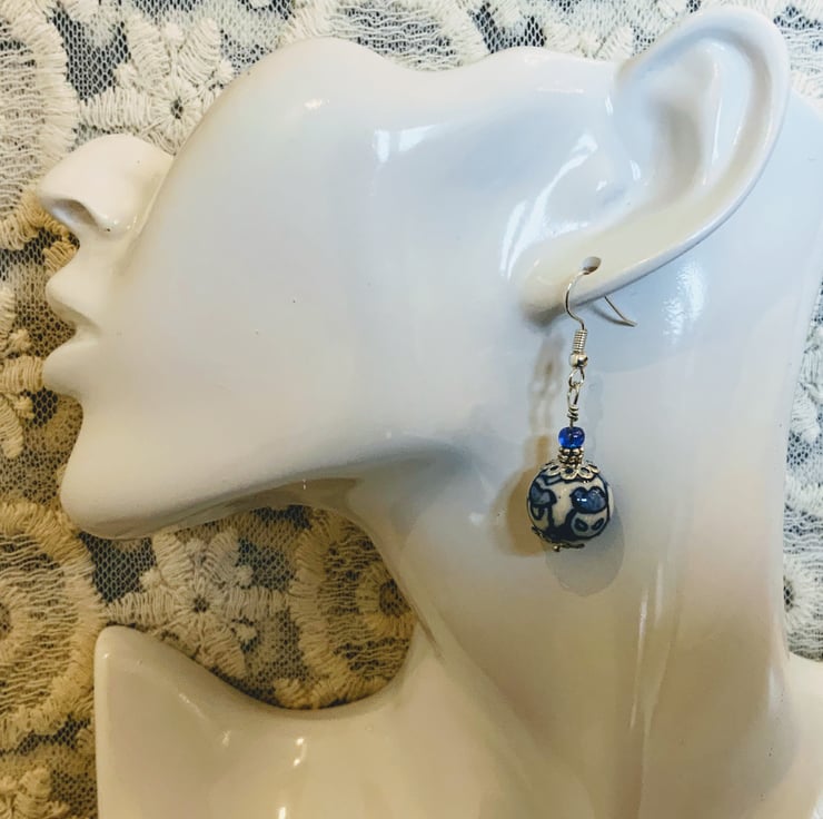 Delft blue bead earrings with silver caps and mini blue rochelles.