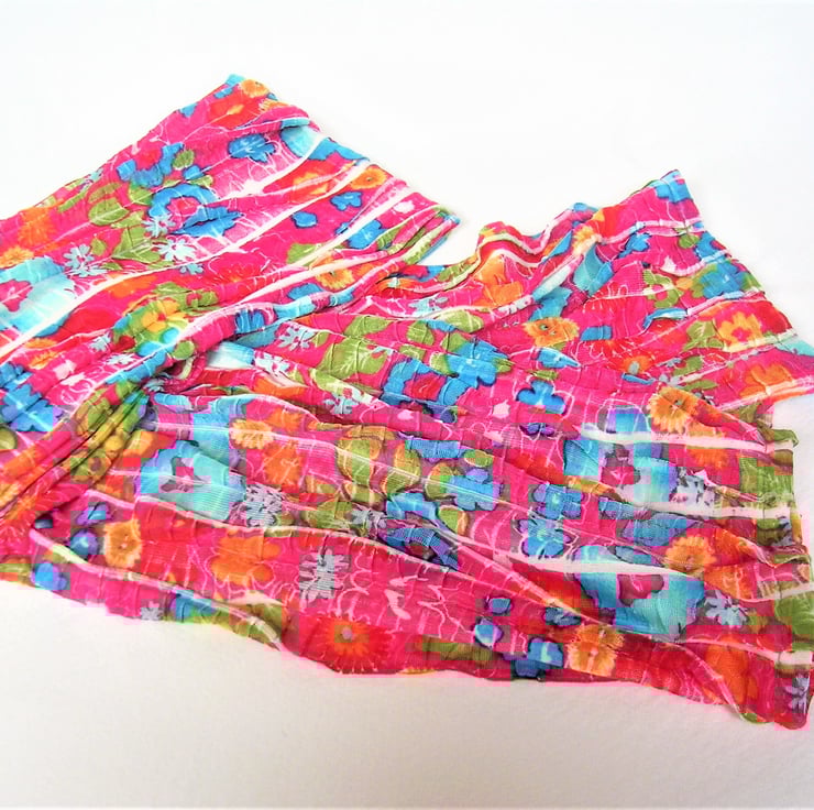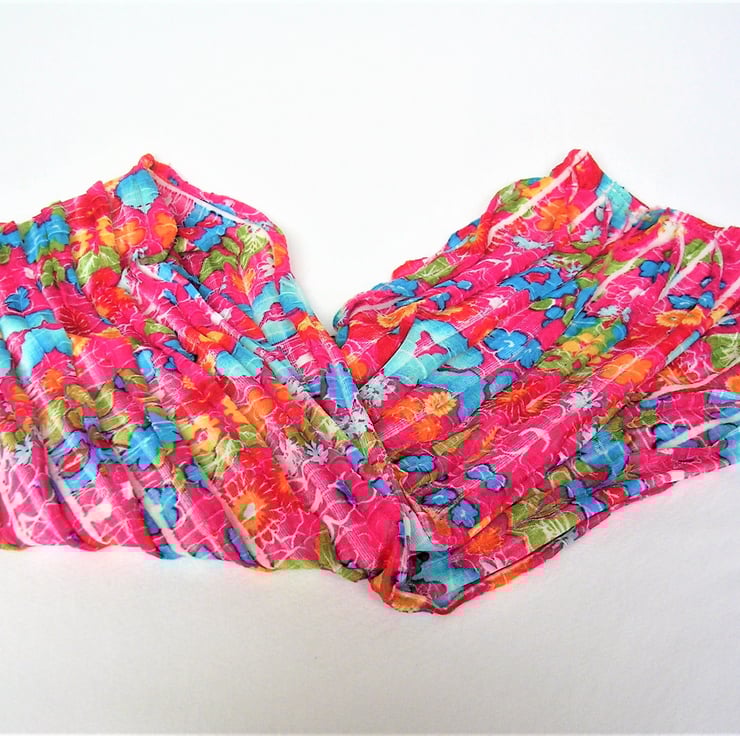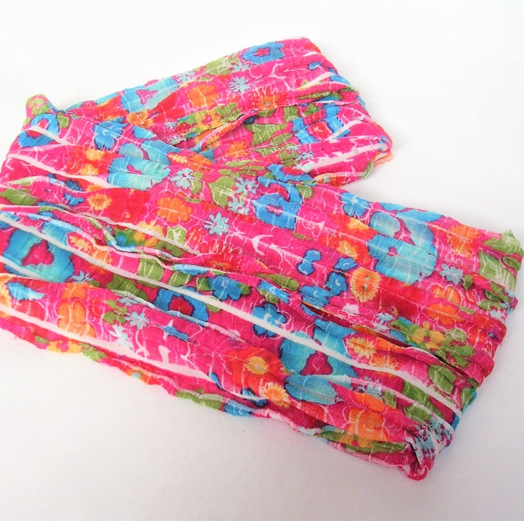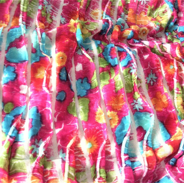 Bright crimson pink background with turquoise, yellow, orange and green polyester 'RaRa' tiered or frilled stretchy fabric.