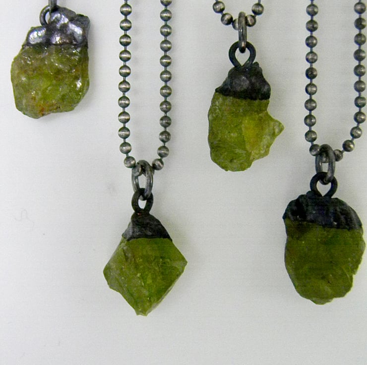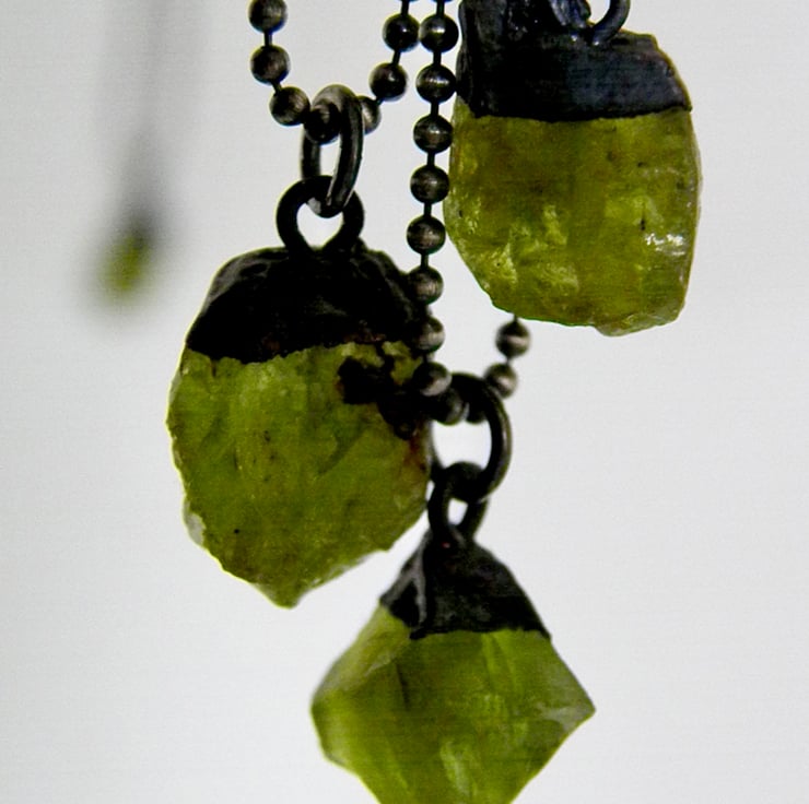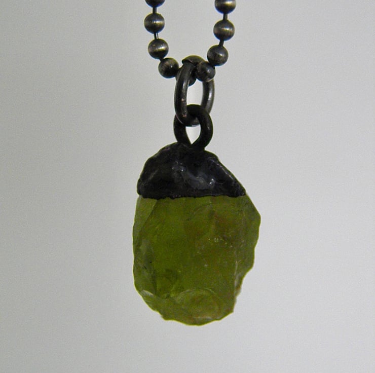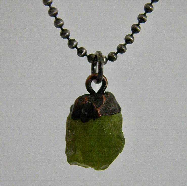 Raw Peridot crystal pendant, electroformed in copper and suspended from a sterling silver ball chain necklace.