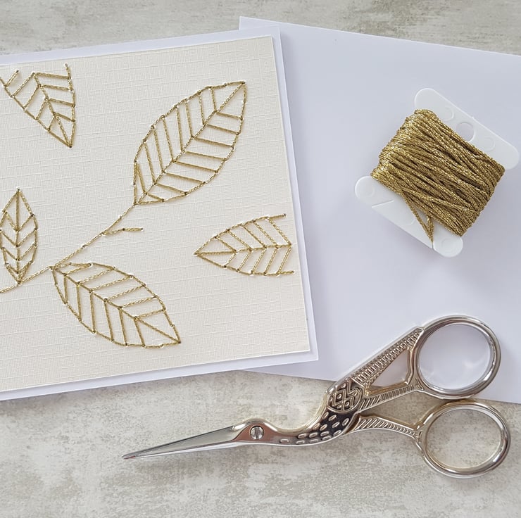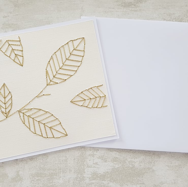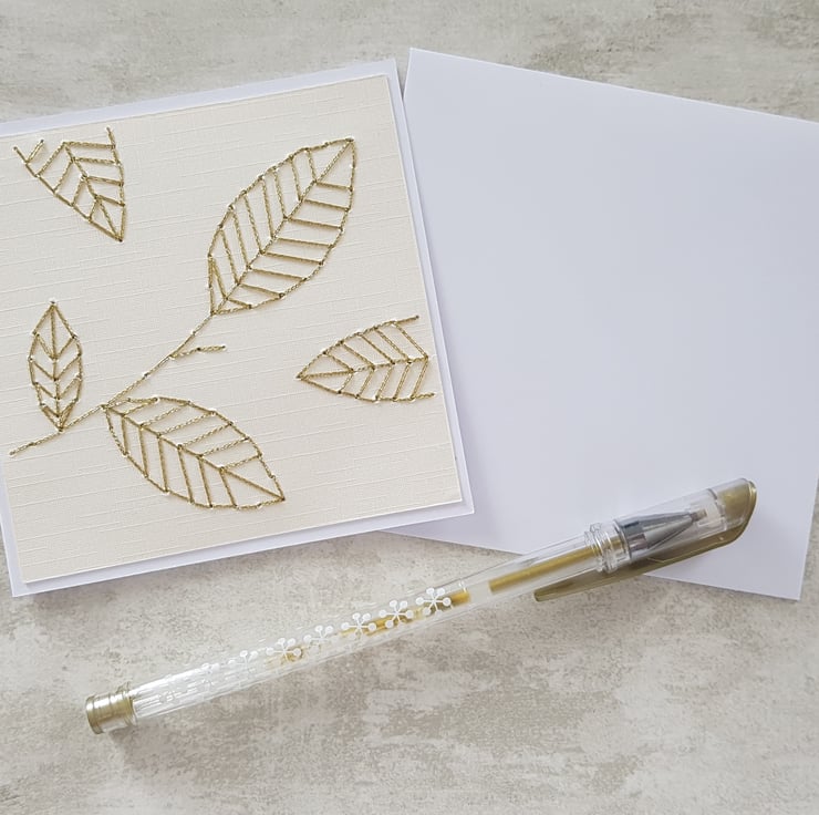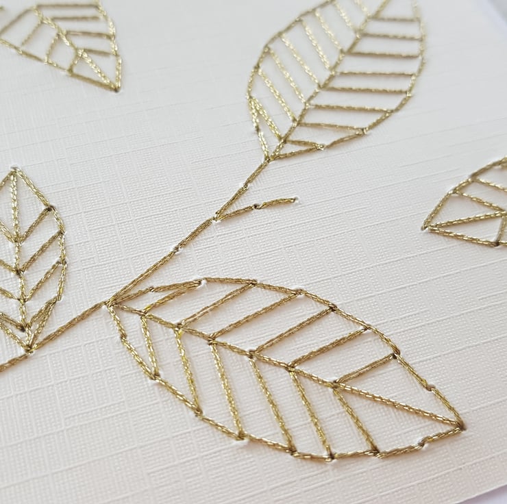 - Hand stitched with shimmering gold metallic threads, the card captures light beautifully and gives it a tactile feel.