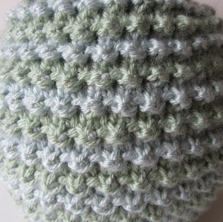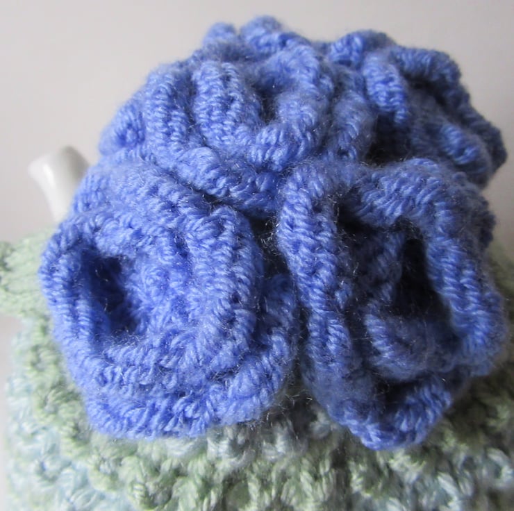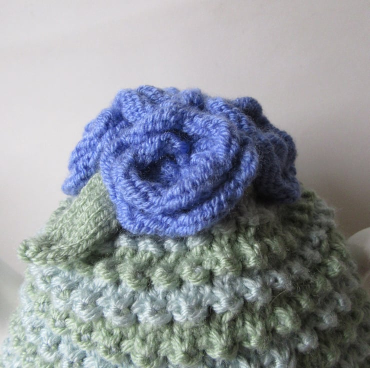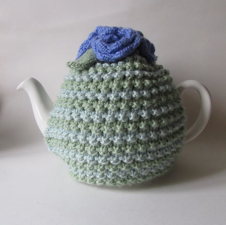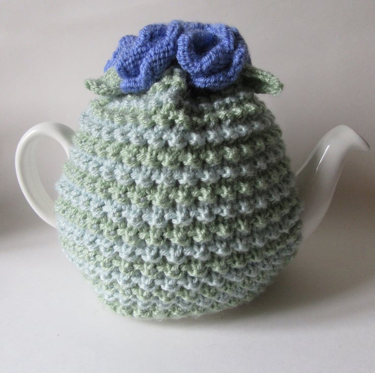 A beautifully hand knitted stripy tea cosie with lavender coloured roses on top. The body of the tea cosie is knitted in a nobbly stitch lending a 3D effect for extra thickness. It is knitted in duck egg blue and pale green thin stripes. The cosie fits snugly around the pot, yet with enough ease for a swift removal when a top up is required. The tea pot handle peeps through the side opening so it dosnt get too hot to handle. On top there are six rose like flowers using lavender coloured yarn and three pale green leaves. It fits a standard 4 - 6 cup tea pot.