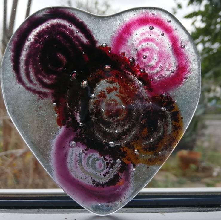 These heart shaped fused glass coasters with swirly vibrant warm coloured flower designs are an ideal gift for someone you care about. As well as being used as coasters, they can also be lovely suncatchers to stand against a window. They are sized about 12 x 10 cm and have smooth bottoms.