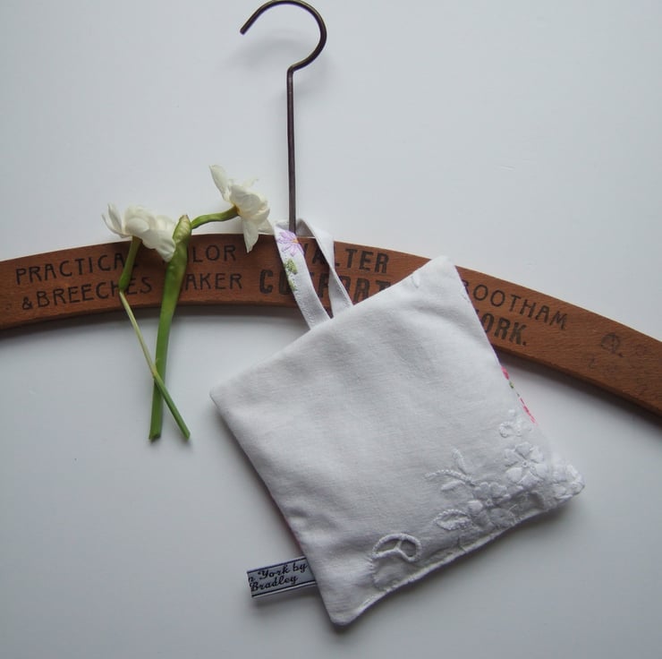 The front is made from vintage embroiderey, and the back is made from a section of an old white tablecloth, with 2 tiny holes to let out the lavender scent.