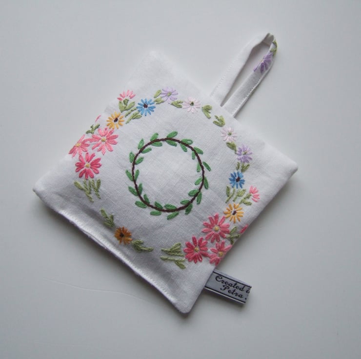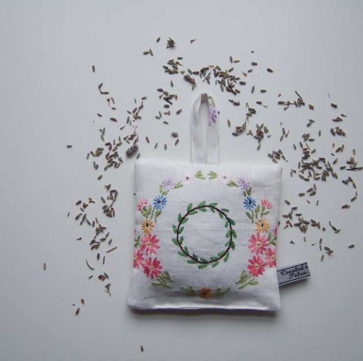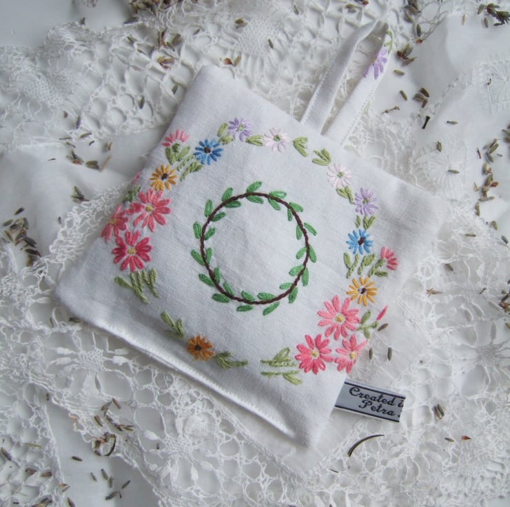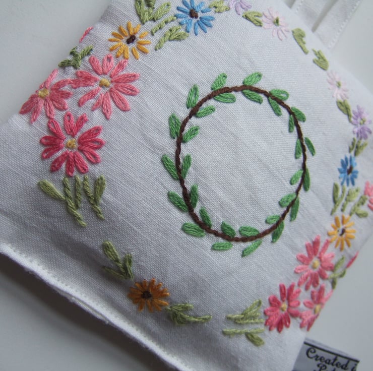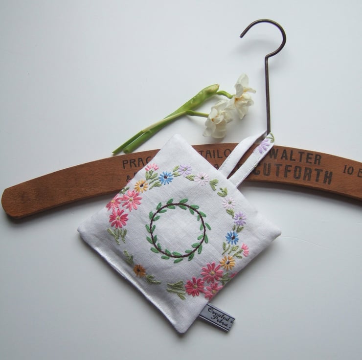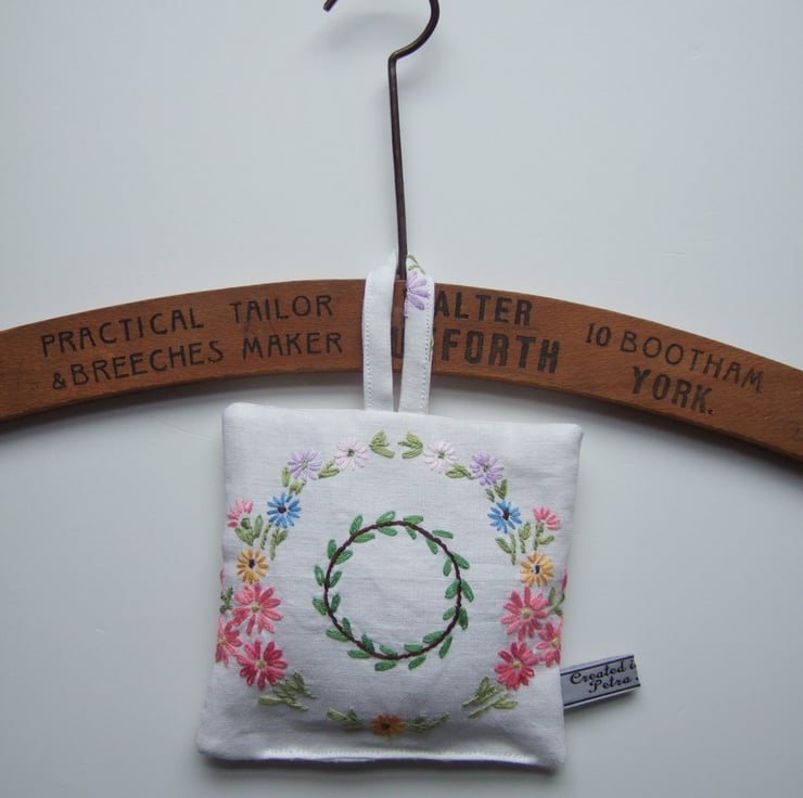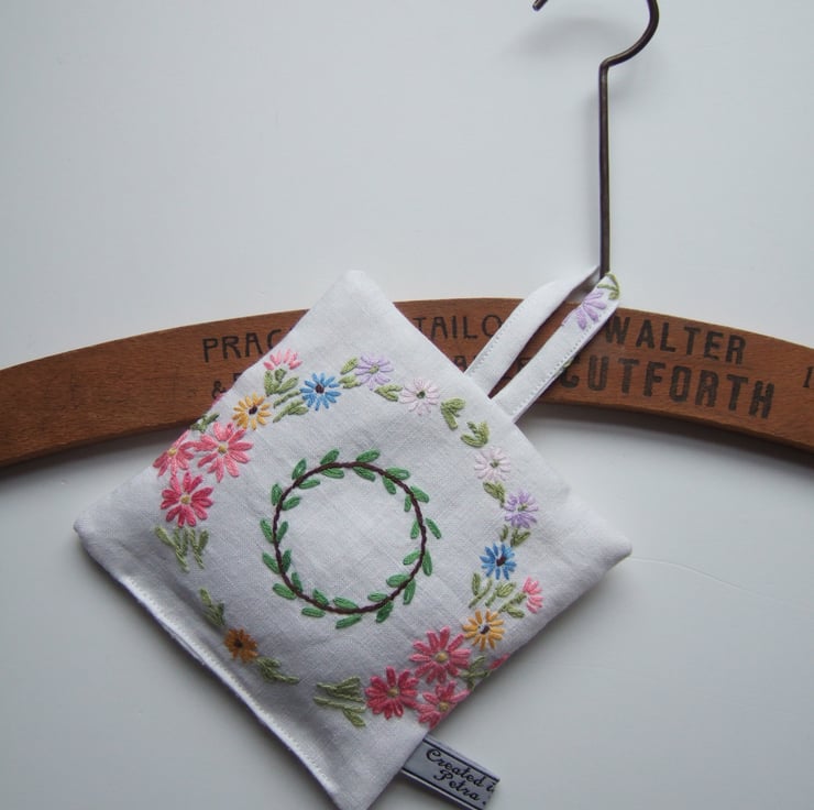 This pretty floral lavender bag is made from the corner of a hand embroidered vintage tray cloth. It has a little green wreath stitched in the centre, which is surrounded by a circle of sweet wild flowers. Inside is nestling a little muslin bag filled with lavender from Terrington in North Yorkshire. Lavender is an ancient remedy for helping healthy sleep, and a natural way to keep away those pesky moths. Pop it in a drawer for sweet smelling clothes. This would make a lovely present for a new bride storing her wedding dress, for a vintage fabric lover, or perhaps for someone just starting to learn to embroider.