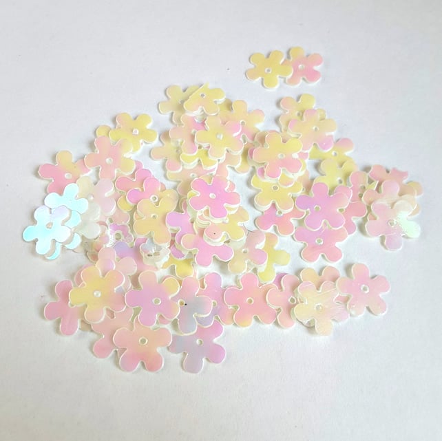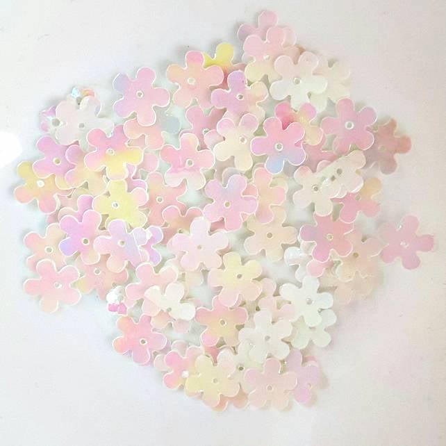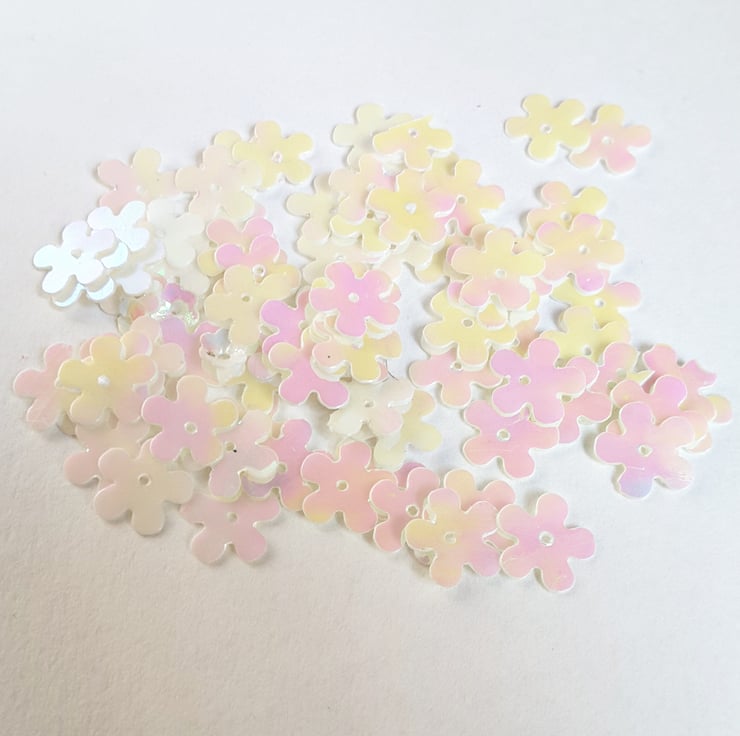 Beautiful opalescent flower sequins with 1hole for sewing onto your fabric.