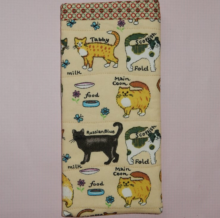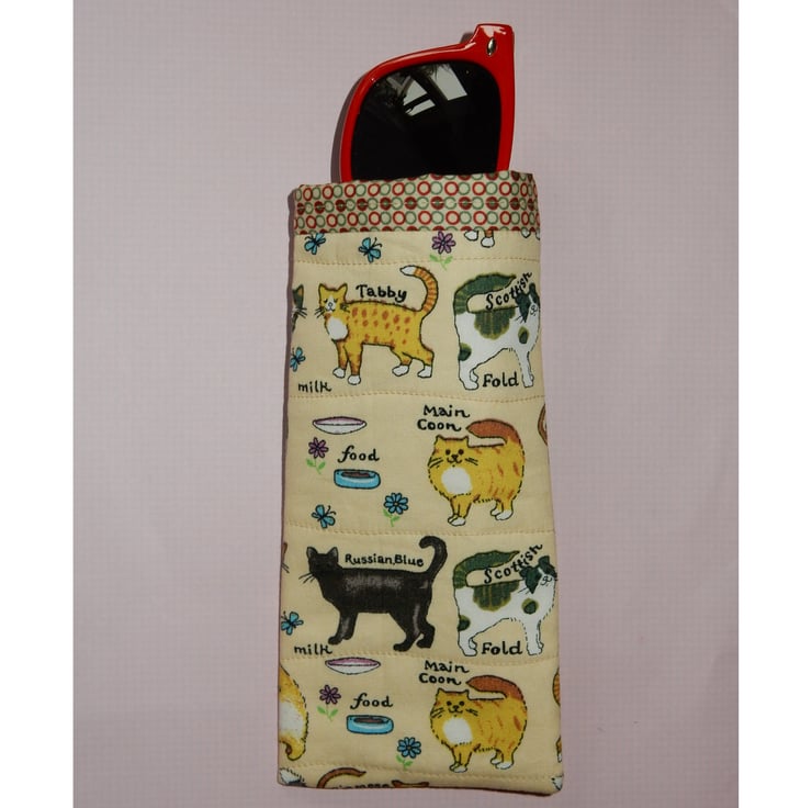 This is one for the cat lovers, a fun case for your glasses or sunglasses, featuring various breeds of cat, with their dishes of food. It is made from cotton print fabrics with a layer of wadding for protection and a contrast trim and lining. This is a slip in style glasses case, if you require a case which fastens please view my other listings.