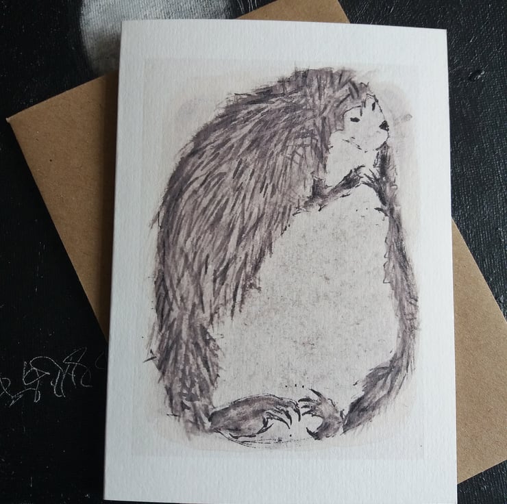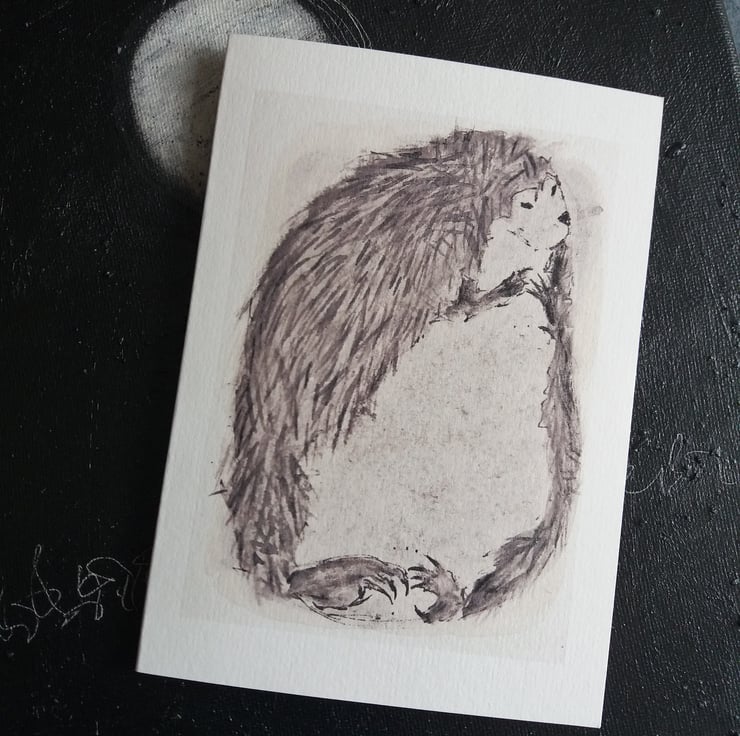 inspired by the little wild hedgehogs that come to snaffle in our back garden in the dark of night. the little artwork this was printed from was created during the time they were fattening themselves up ready for their long winter slumber.