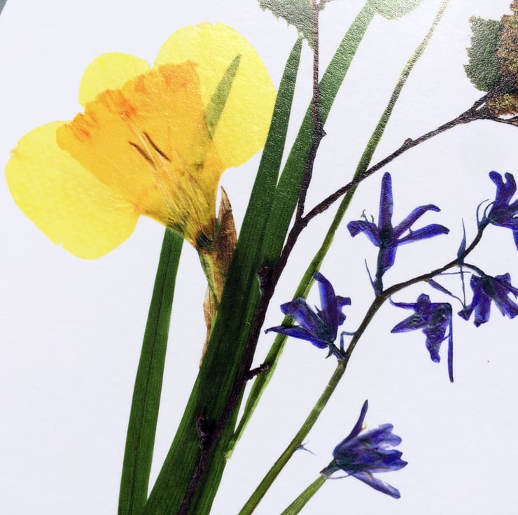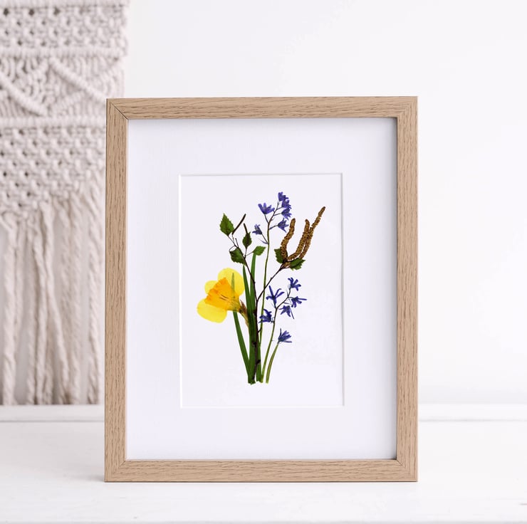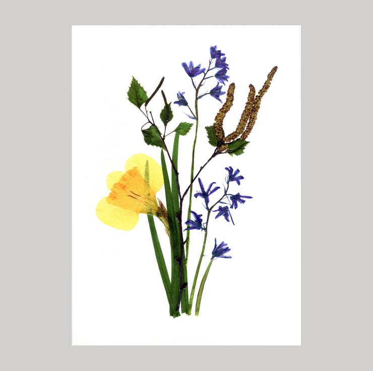 Pressed Flower Art print A5, GICLEE, Daffodil, Bluebell and Birch