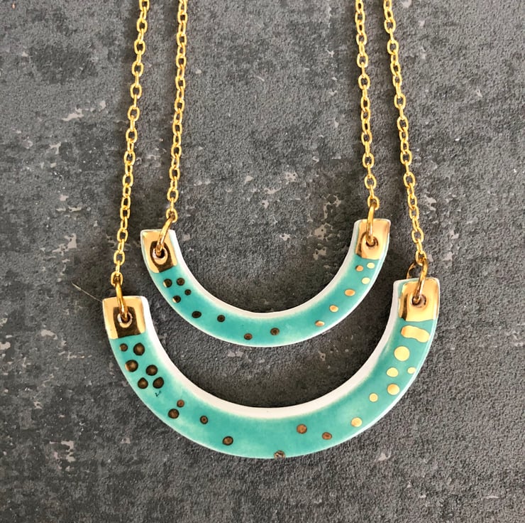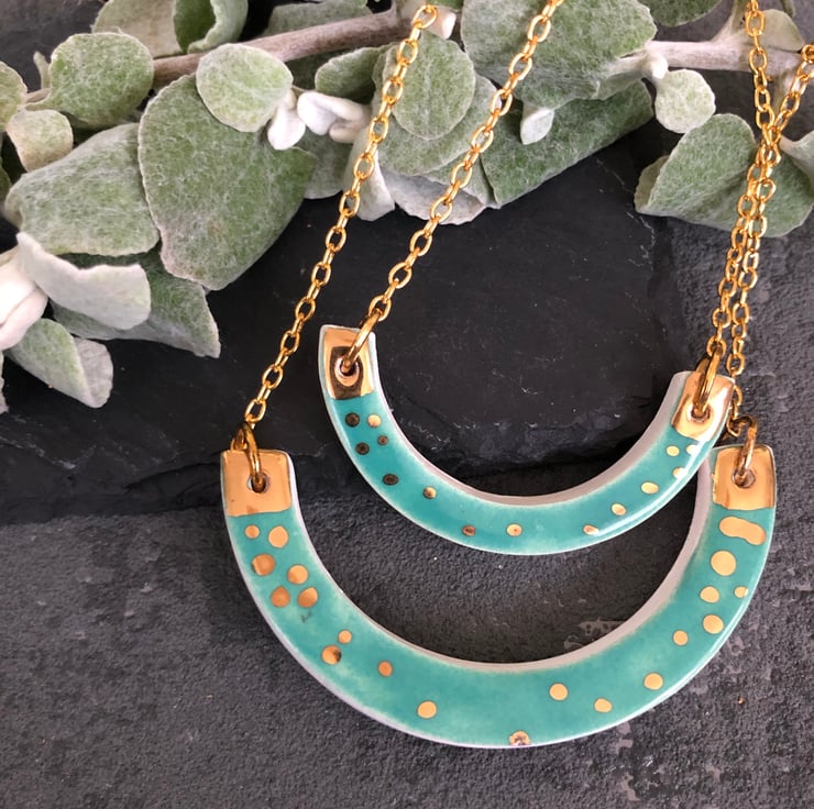 A ceramic pendant necklace made with a white earthenware clay, glazed in a vibrant glossy mint green and finished with a genuine gold lustre decoration.