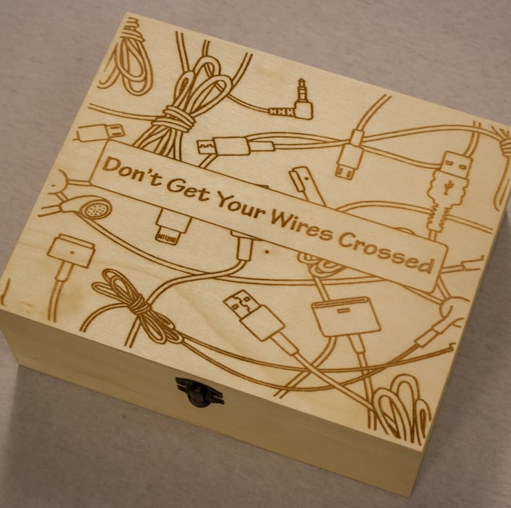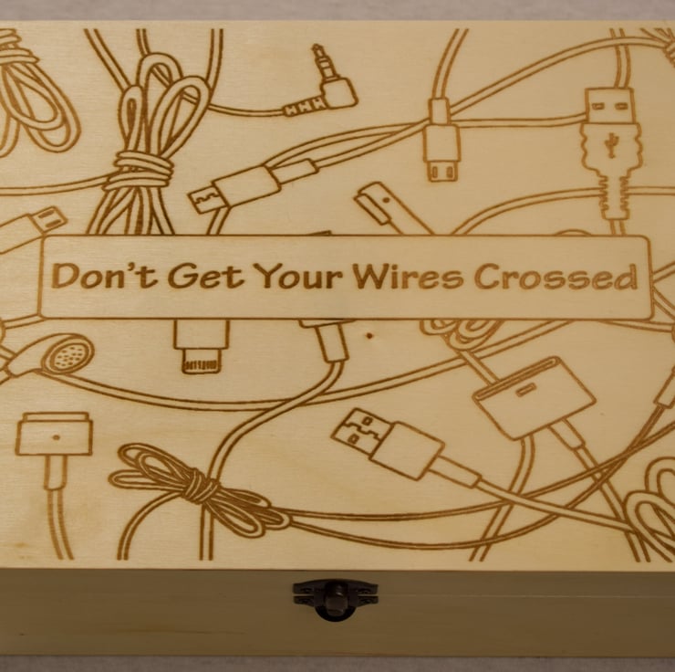 With a lid engraved with a wire based design, and humorous phrase, this hinged wooden box has a simple clasp to keep it secure. Large enough to take many wires and chargers yet small enough to be unobtrusive, this is the perfect accessory to keep your home looking clutter free.