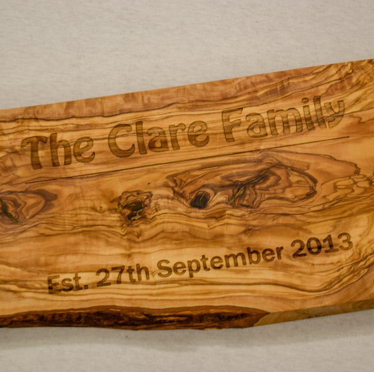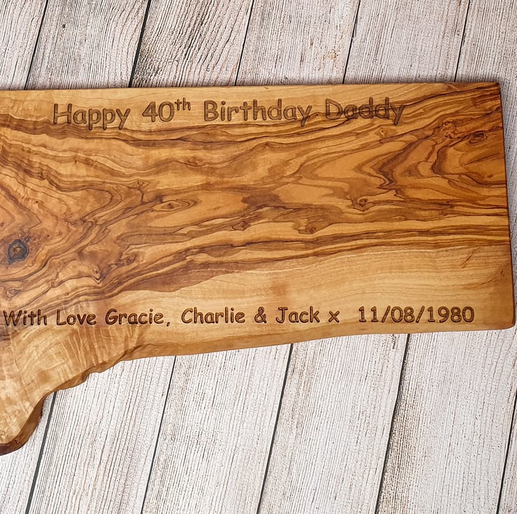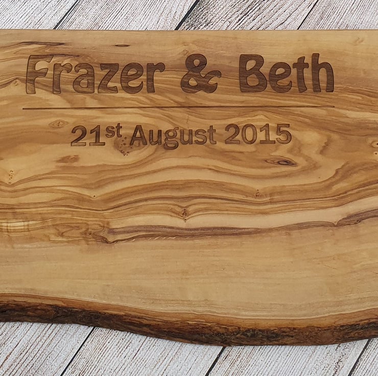 This semi-rectangular rustic chopping board features a deeply engraved personalised names of your choice and the date of a special event in your life. This could be a birthday, wedding day or the day you met.