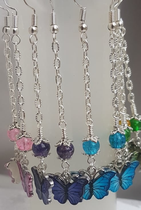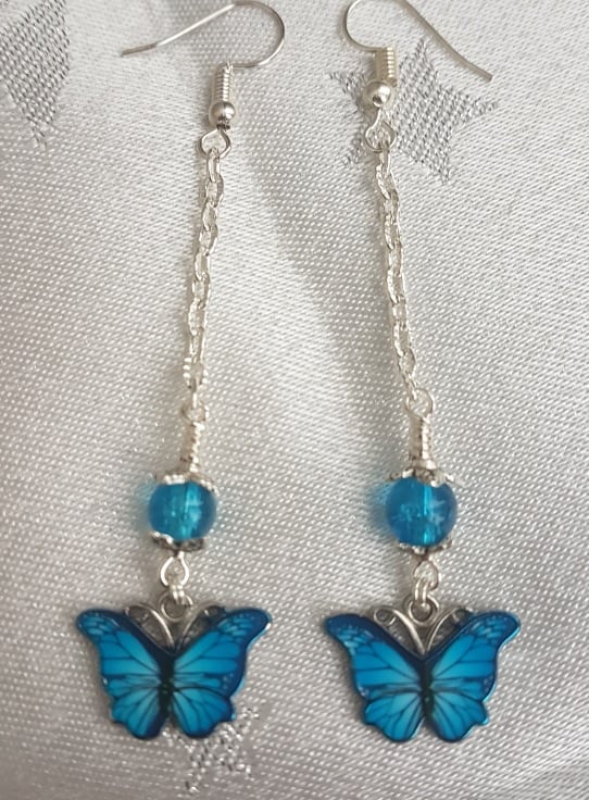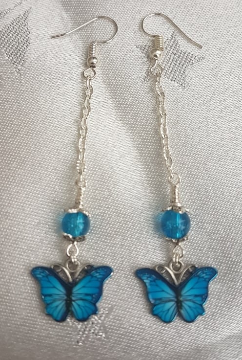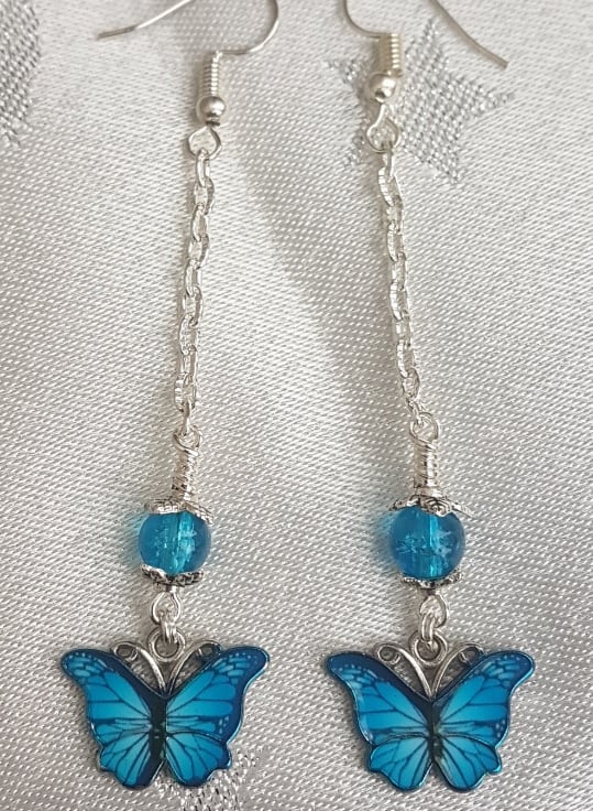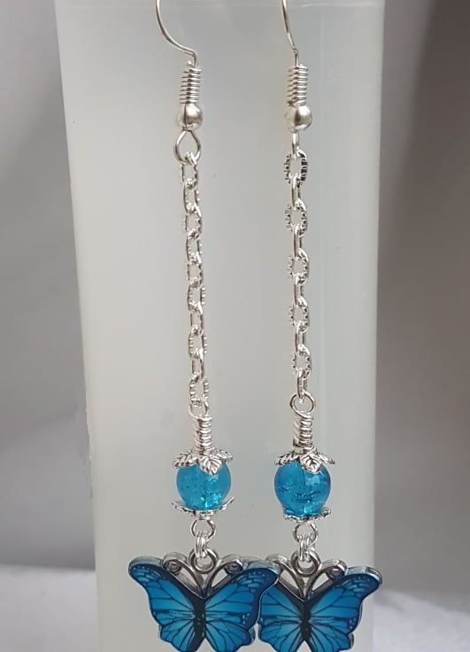 A fabulous dangly pair of earrings. Beautiful Blue butterfly charms and Capri Blue crackle glass beads. Great as a gift.