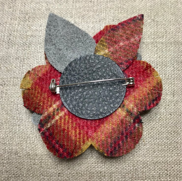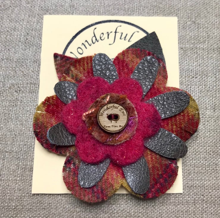 Flower and leaf shaped layers of tweed, leather and felt are sewn together to create a tactile three dimensional flower finished with a cute little walnut button.