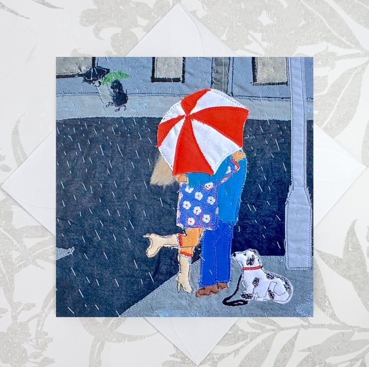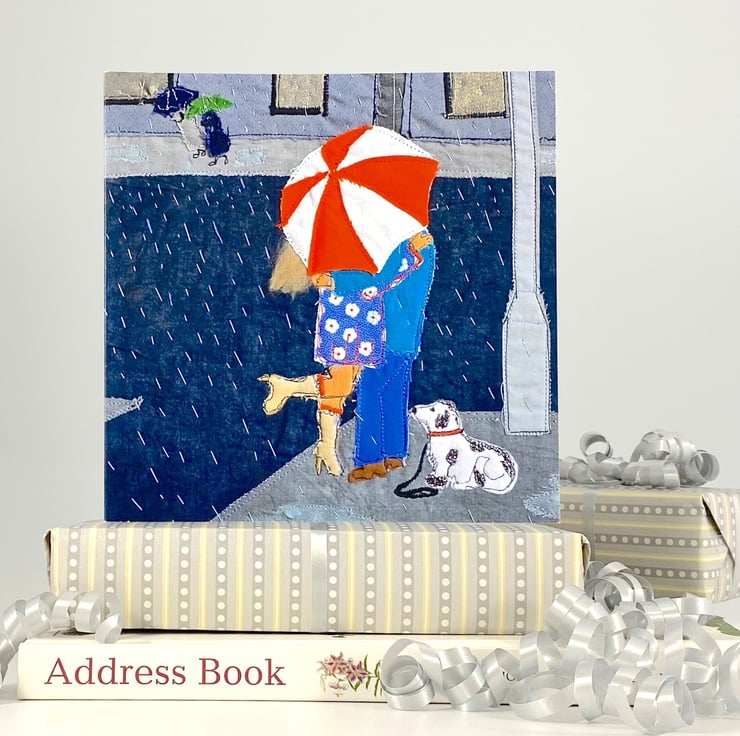 Romantic birthday card - reproduced from one of Heidi Meier's original textile embroideries called At A Junction. Shows a couple in love, having their first kiss whilst the dog looks on in confusion...