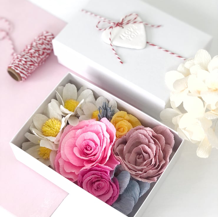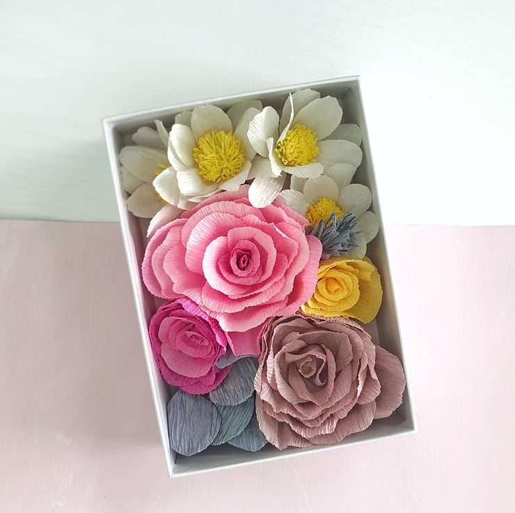 The flowers and leaves are made from premium card stock and Italian crepe paper which has brilliant colours and a texture that mimics nature. I hand cut the petals and leaves from this paper then shape them one by one to create unique dimensions. I put them together into flowers and arrange them to form this elegant boxed bouquet.