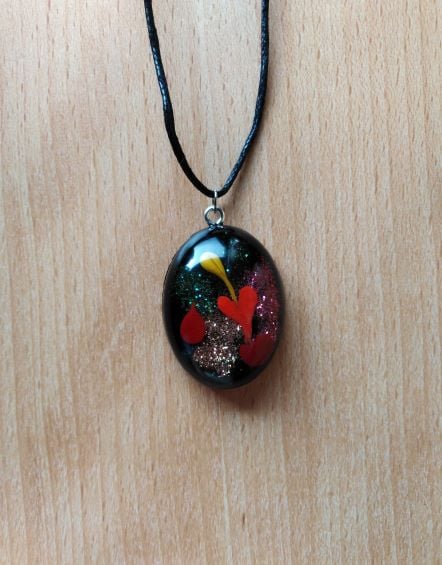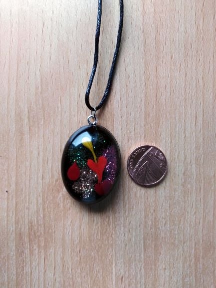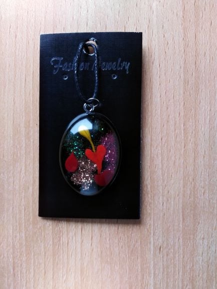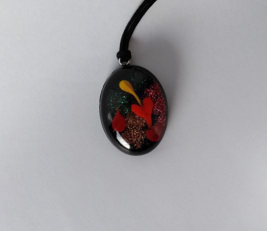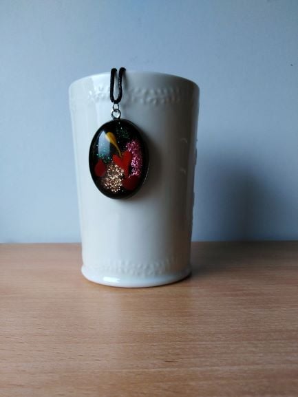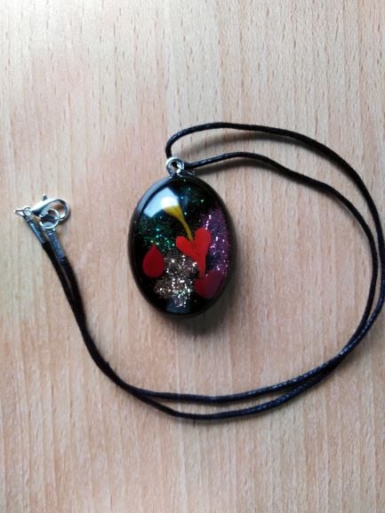 Unusual and playful hand crafted (NO VOC, NO BPA) Non yellowing arts and craft epoxy resin sparkling oval pendant.