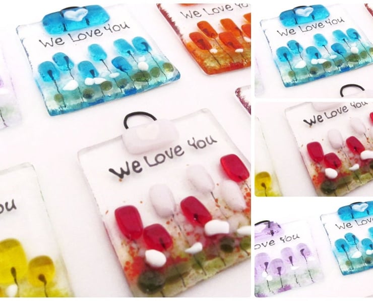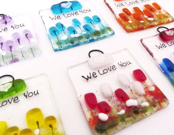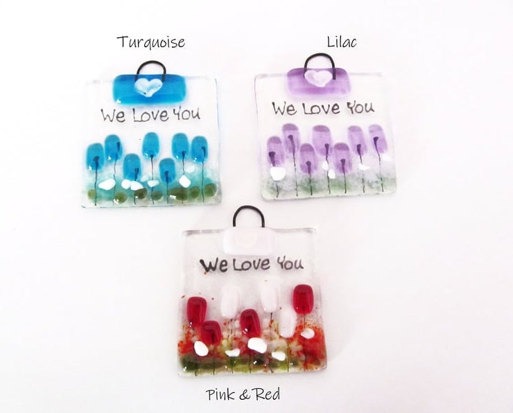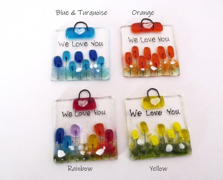 This listing is for a single sun catcher, they are available in a variety of different colours and you will receive a sun catcher in your chosen colour group. Each one is hand made with specialist fusing glass and has the title 'We Love You' fired into the glass.