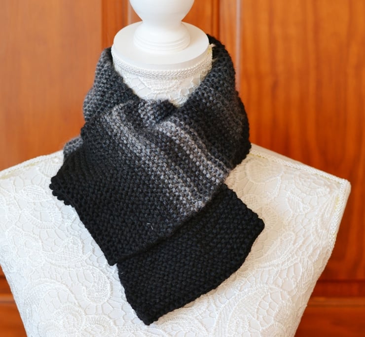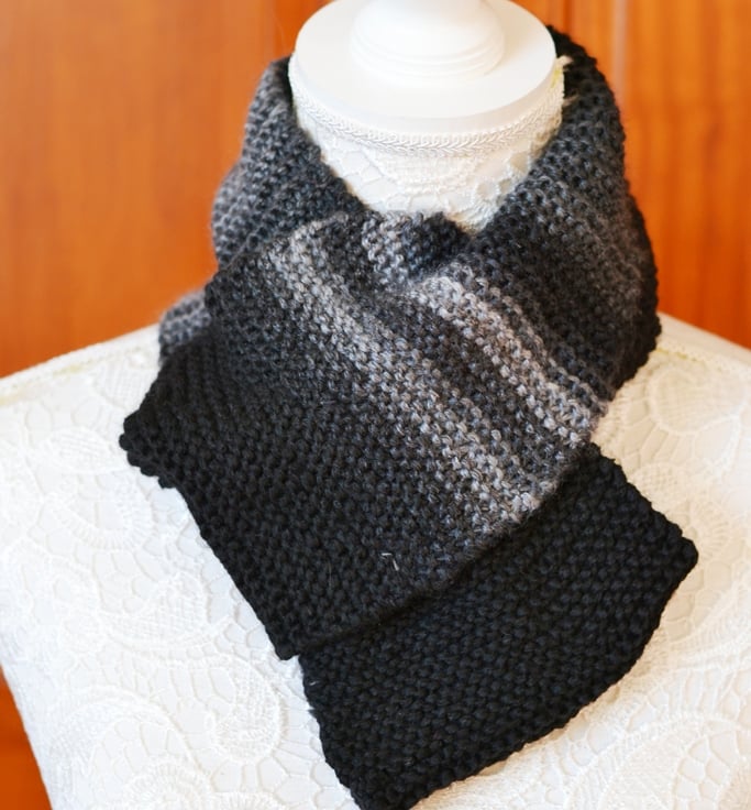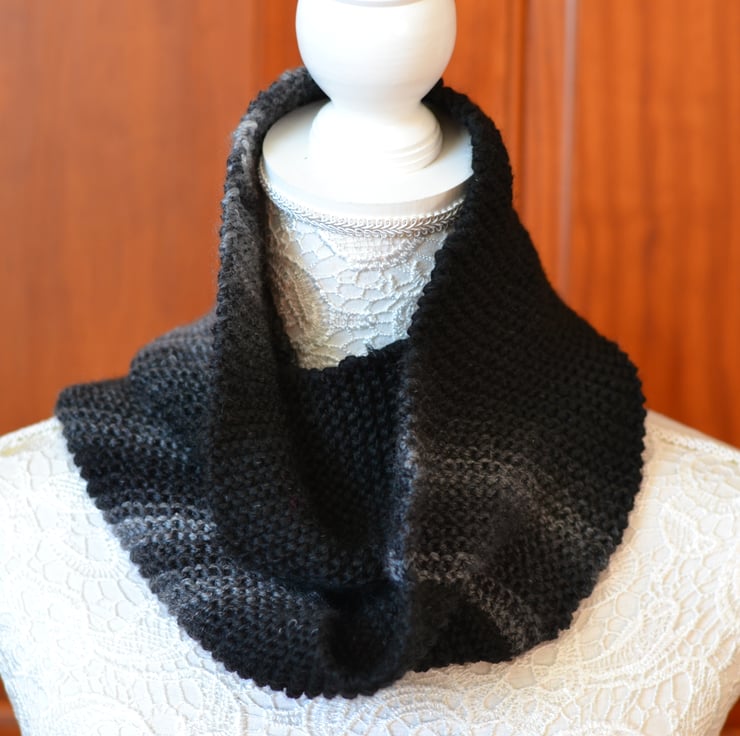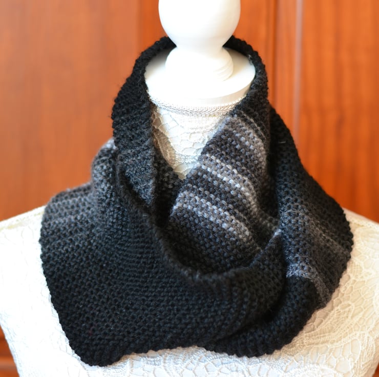 Handknitted black and grey nfinity scarf, cowl . Shorter length but will loop round once. 2 ways to wear it as shown in the photo's. Very soft yarn. Different shades of grey with black in a self patterning yarn.