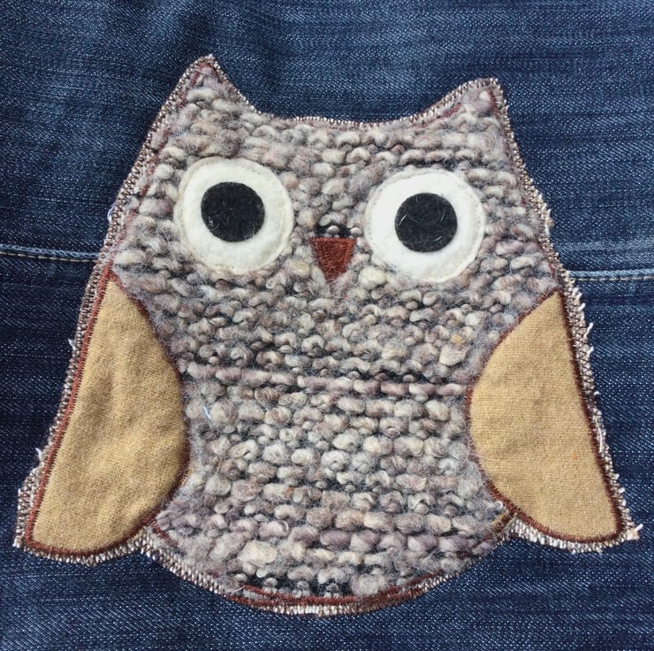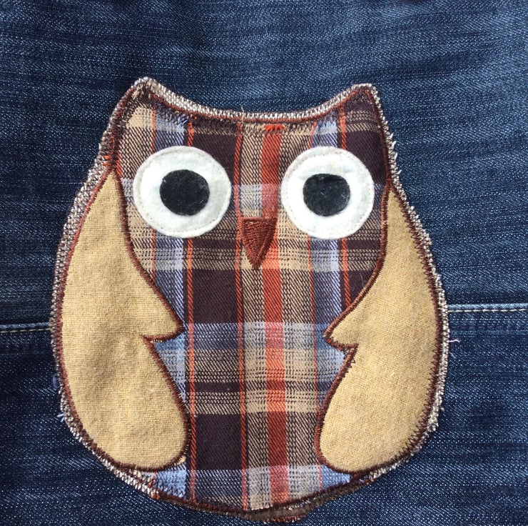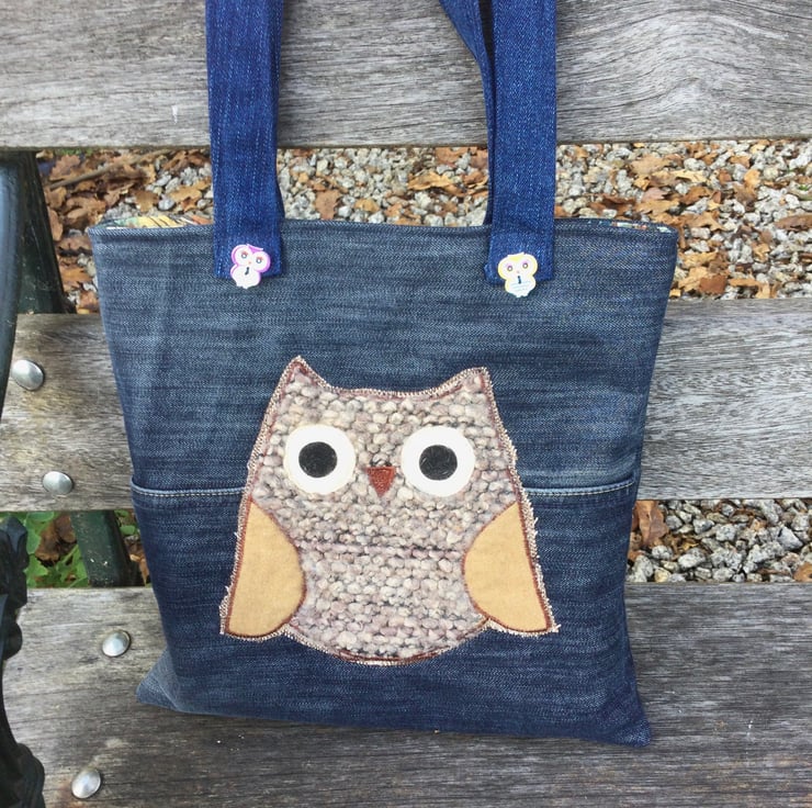 This pretty tote bag is created from the legs of two pairs of jeans. The wear and creasing is due to wear and not because an iron is required! The owl embellishments on both sides of the bag started life on cushion covers.