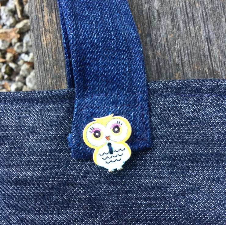 The denim handles in a deeper blue are 71cm long and 3cm wide and four wooden novelty buttons in the shape of owls are sewn onto the ends.