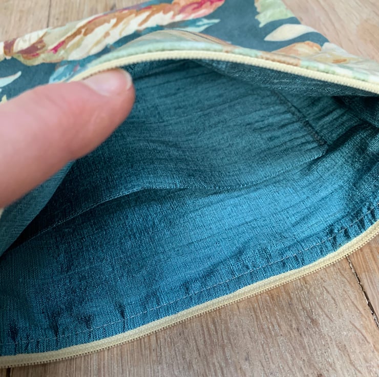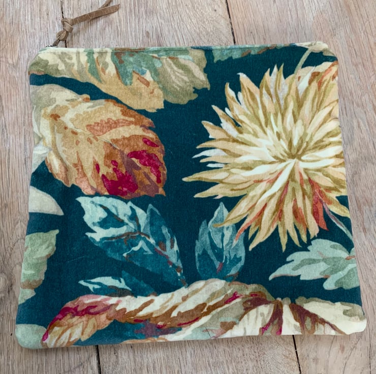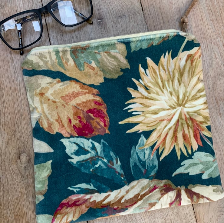 Beautiful clutch bag or zip pouch in Sanderson Dahlia and Rosehip velvet backed with a decadent upholstery fabric with a touch of gold. The floral velvet has a deep teal background with flowers in cream, coral and gold.