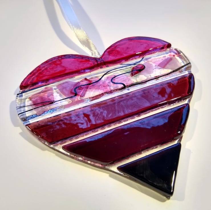 This beautiful fused glass heart light-catcher in vibrant shades of pink would make a fabulous addition to any room. With its colourful, textured design and unique patterned strip, this heart really does catch the light when hung in a sunny window, but it also looks stunning when displayed on a plain wall. It measures approximately 10cm and its widest and longest points.