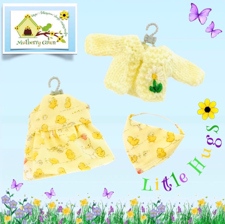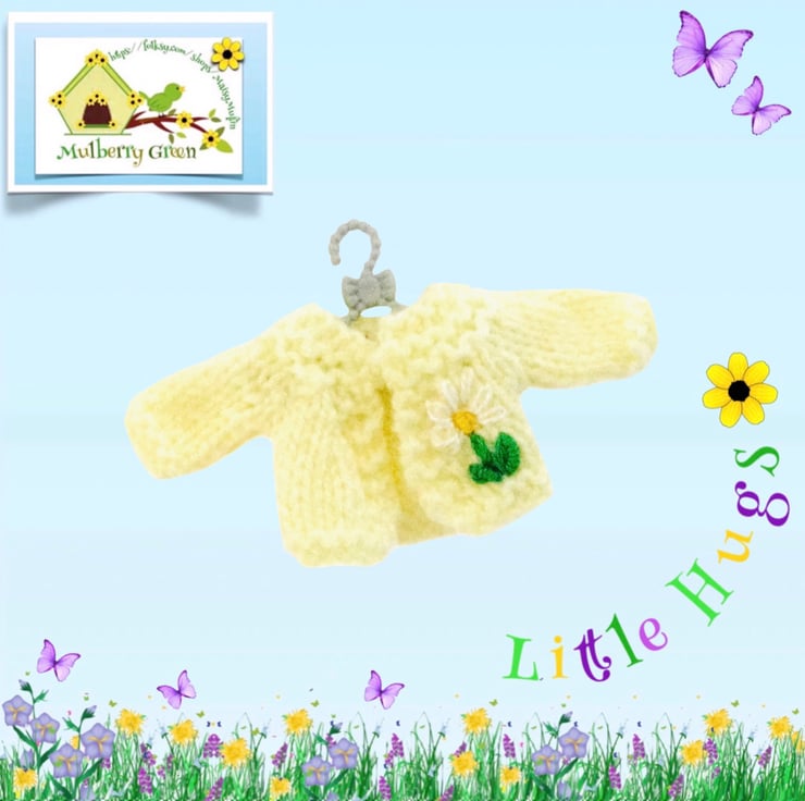 Just the sweetest little lemon cardigan embroidered with a daisy to fit the Little Hugs dolls or baby Daisy. It comes on a cute little hanger and matches the cheerful chicks dress and matching headscarf.