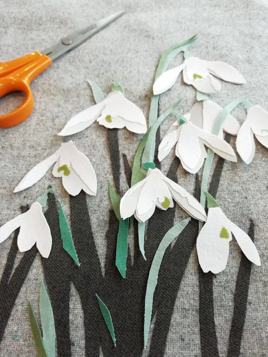 Original fabric appliqué designs which have been scanned, and then printed onto recycled card.