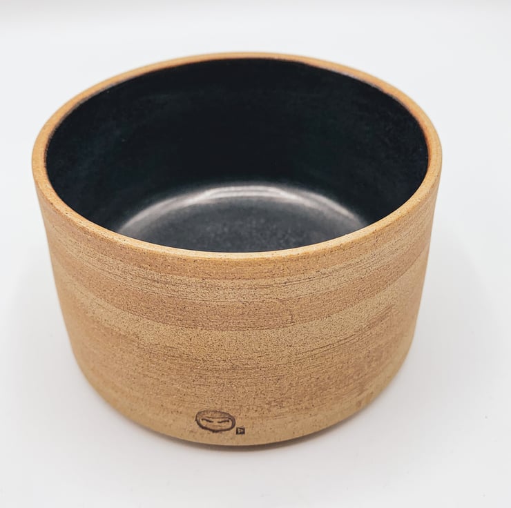 Hand crafted bowl with a raw clay exterior and glazed in a fluid gunmetal/black inside.