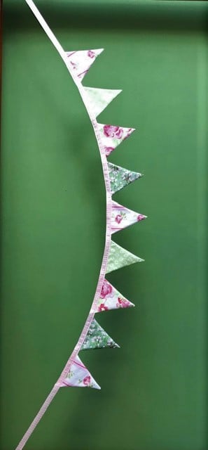 The bunting comprises nine little flags sewn from four different fabric patterns stitched onto vintage style gingham ribbon. It measures approximately 94cm with additional 30cm ties and each end.
