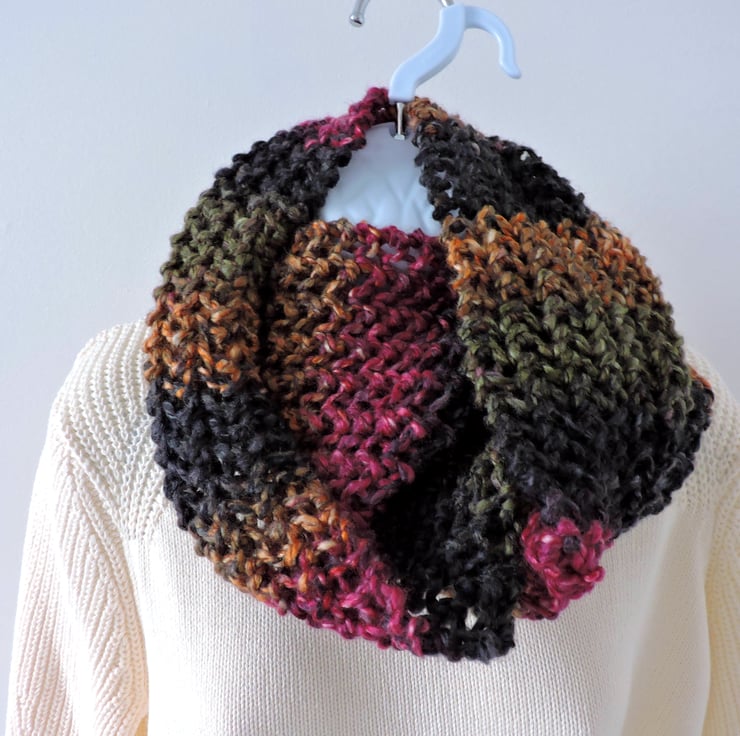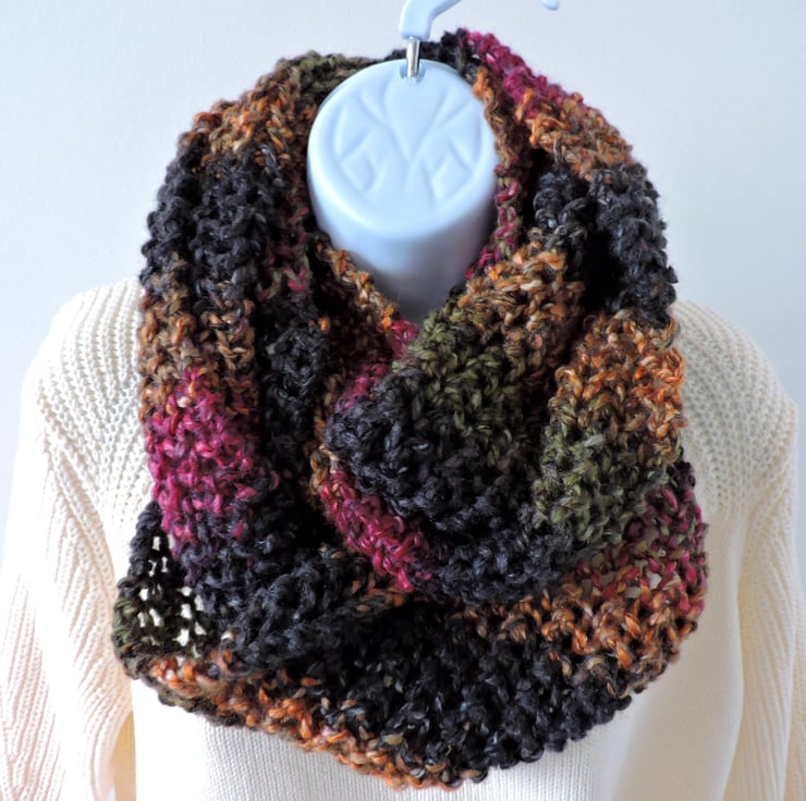 This infinity scarf, circular scarf has been knitted in a simple open knit pattern with a super soft chunky premium acrylic yarn. A lovely mottled scarf in raspberry, olive, dark grey and gold.. A soft and cosy winter warmer, wear it long or wrapped twice around your neck to make a cowl to keep you snug and warm. .